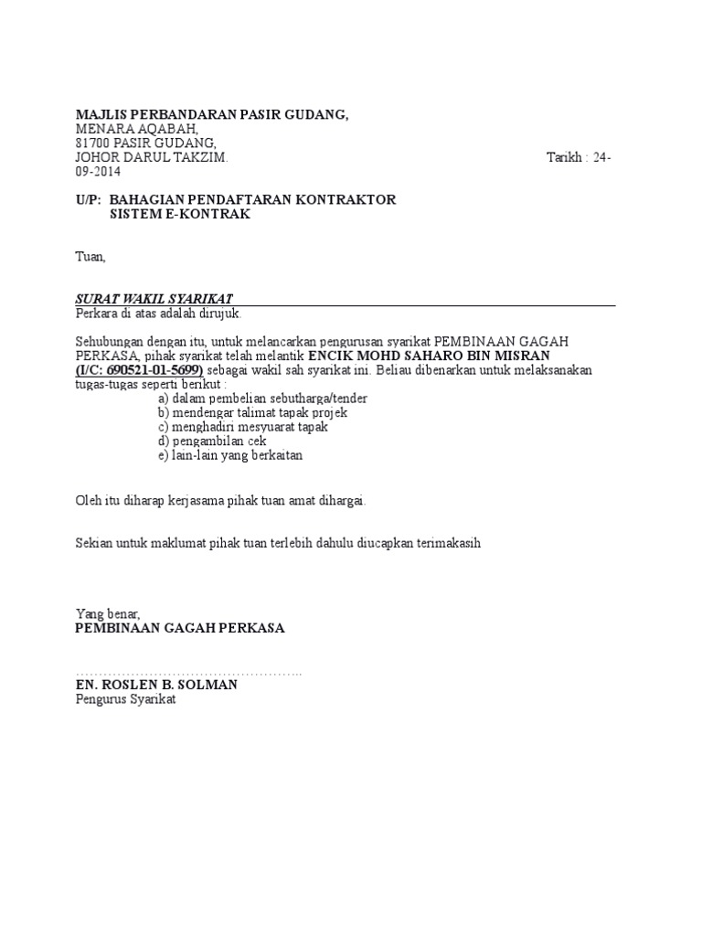 Surat Wakil Syarikat - Surat Wakil Majikan Syarikat Contoh Surat Wakil Majikan Contoh Surat Kuasa Yang Benar Dan Turorial Lengkap Cara Membuatnya. Butir butir pekerja kami adalah seperti berikut nama pekerja no. Sebab dijadikan wakil syarikat untuk urusan myeg. Lantikan contoh surat pelantikan wakil syarikat. Maklumat pegawai adalah seperti berikut: 12 3 2015 6 30 23 pm.